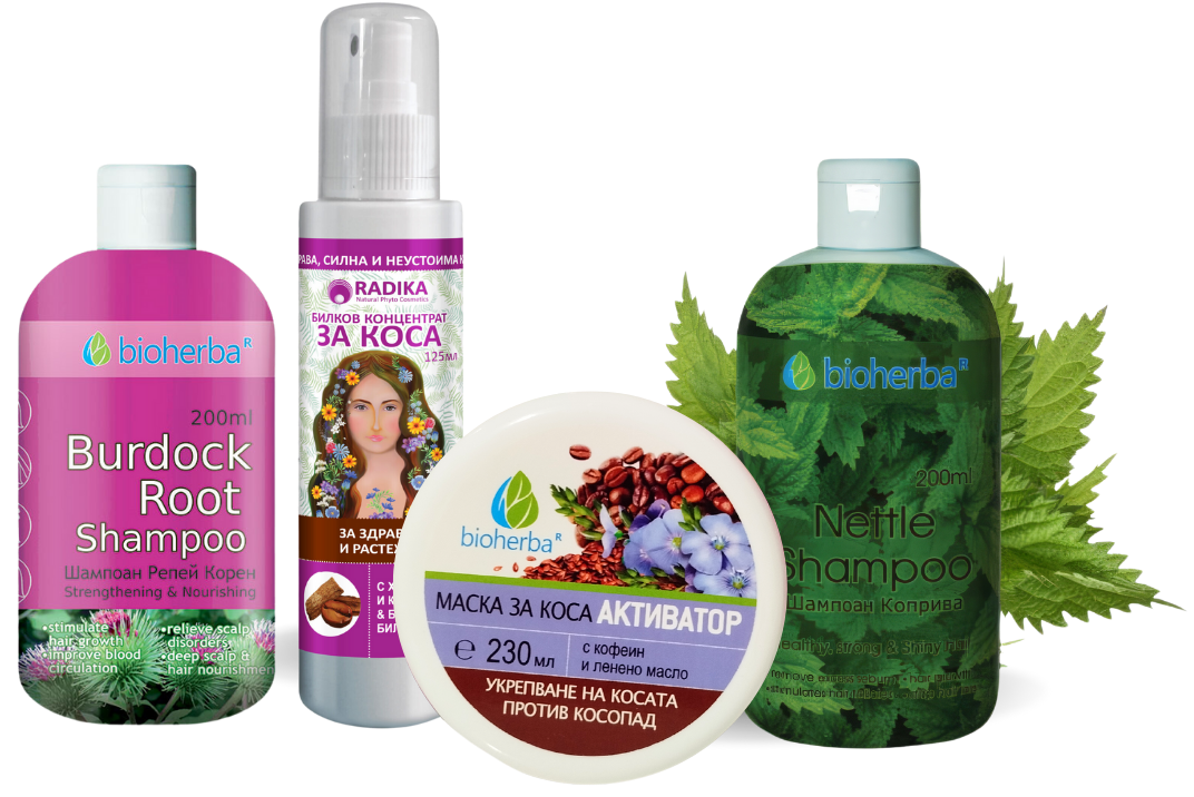 Нашите продукти спират косопада, стимулират растежа на нова коса, подхранват и възстановяват косата благодарение на естествените съставки като магнезий, цинк и витамини B и C. Те също така укрепват косъма и осигуряват защита от вредни радикали.