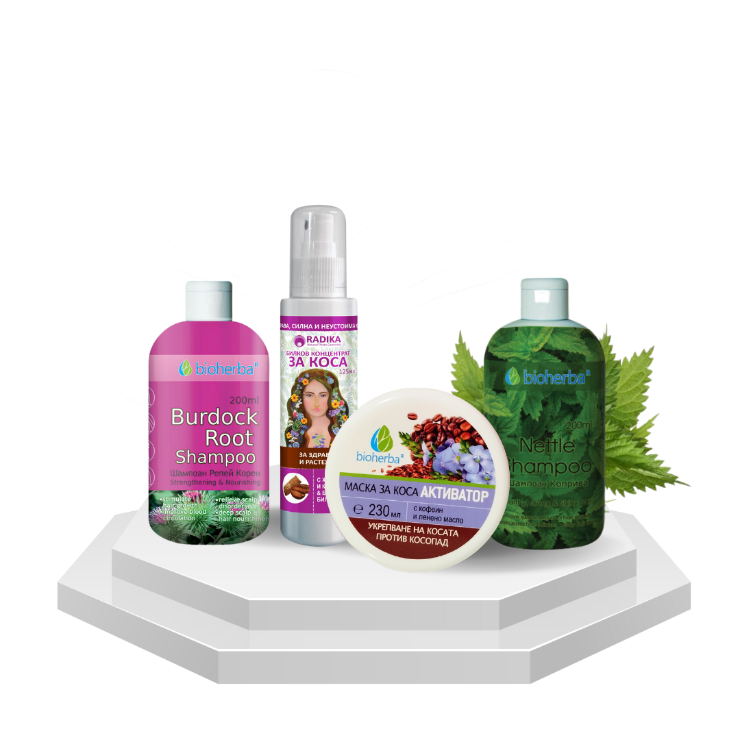 Комплектът включва шампоани с натурални съставки и маска с подхранващи масла, които въздействат в дълбочина на скалпа и укрепват корените, както и спрей с хинин и кофеин.